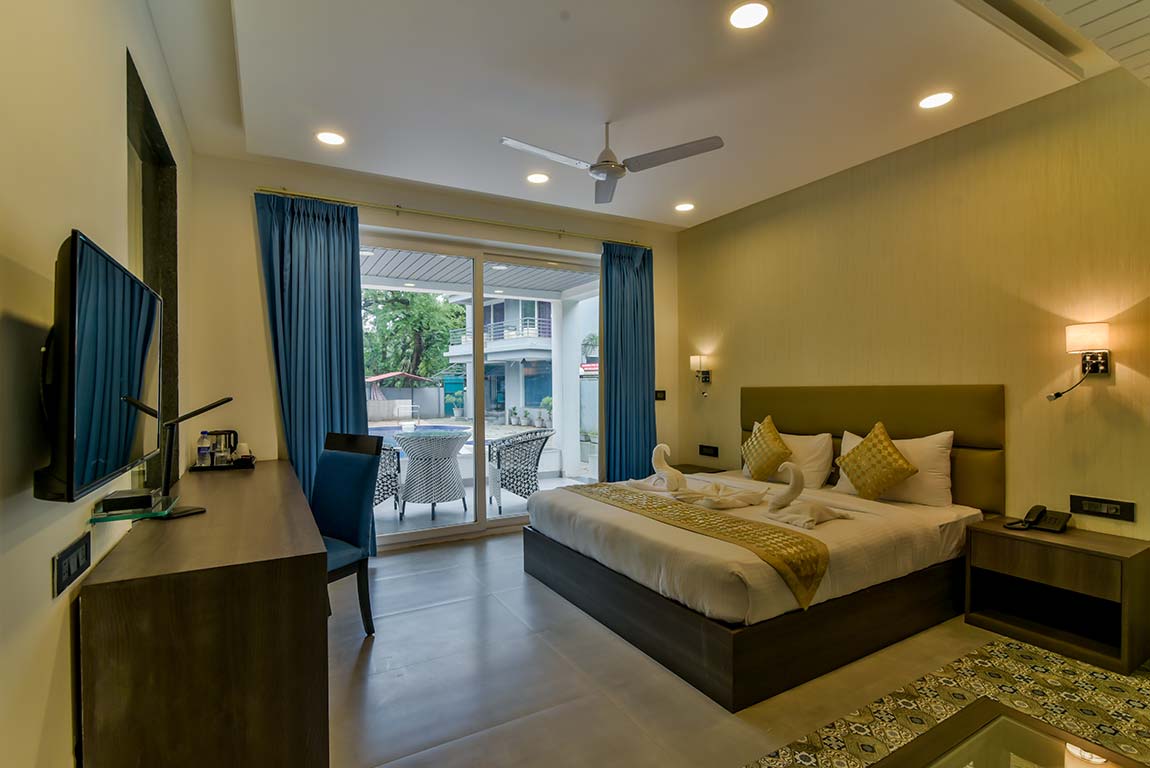 Enjoy the comfort of a king-sized bed at one of the most ideally located hotels in Goa. The Superior Deluxe Room at RAMATAN RESORT offers a separate work space, and a host of amenities such as a hair dryer, safe, iron and tea/coffee maker for your convenience. There’s a wide LED tv and free Wi-Fi as well. It also has the pool view side balcony where guests can sit , kick back , relax and soak in the buzz of north Goa life, with a hot cup of tea in the morning and a chilled beer in the evening.